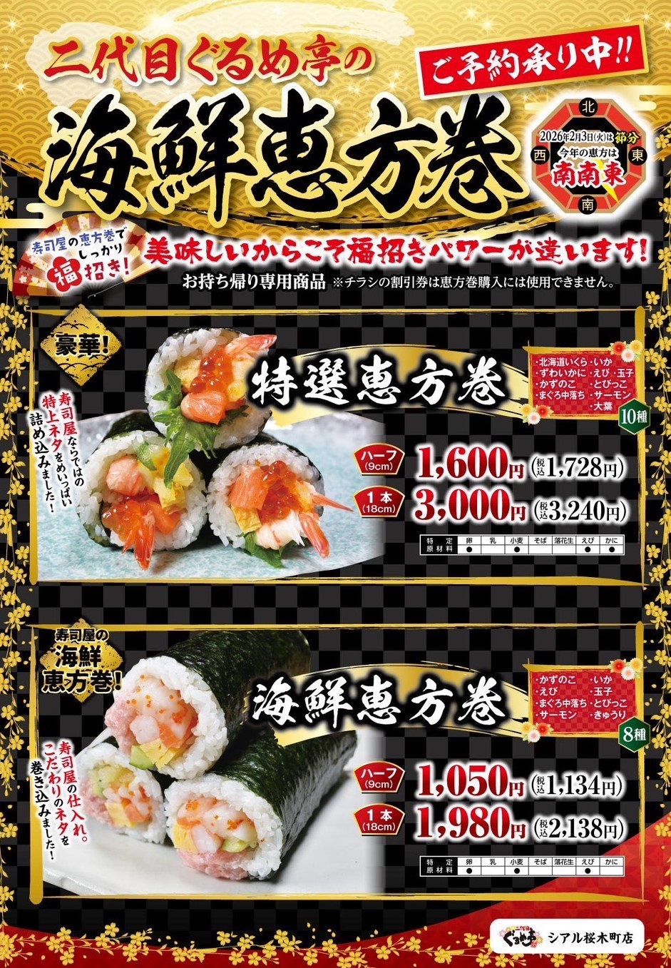 二代目ぐるめ亭シアル桜木町店では、お寿司屋ならではの厳選ネタを贅沢に巻いた「恵方巻」のご予約を承っております。 一口食べれば福が舞い込む、圧倒的な満足感をお約束します。
